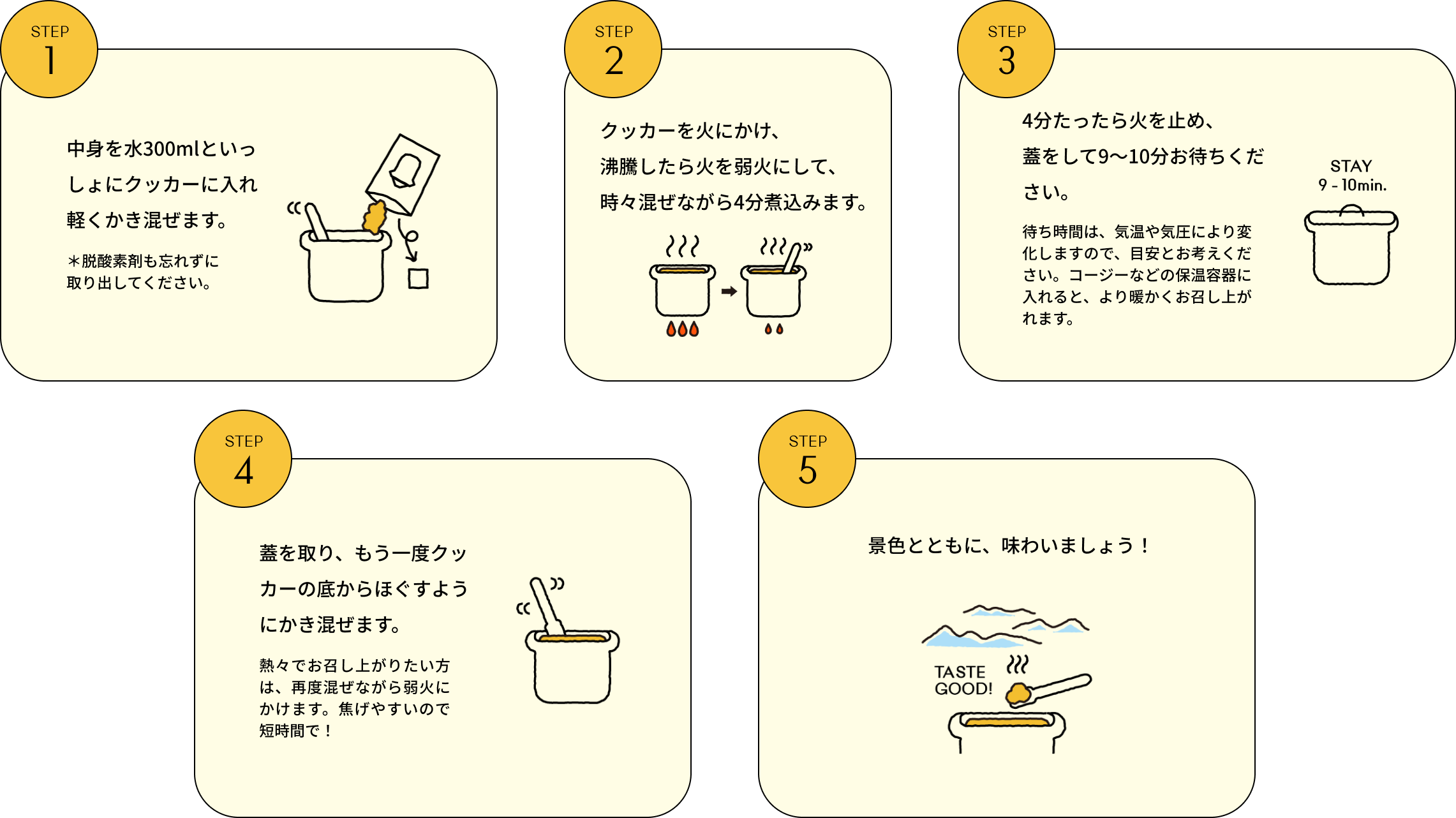 山深く入っていき、息を切らし登り切った山頂で眼下に広がる遠い街並み。そのずっと向こうには海がある。陽が沈むテン場で、遠い海の潮風を想いつつ、この塩辛クリームの濃厚な旨味に没頭することでしょう。