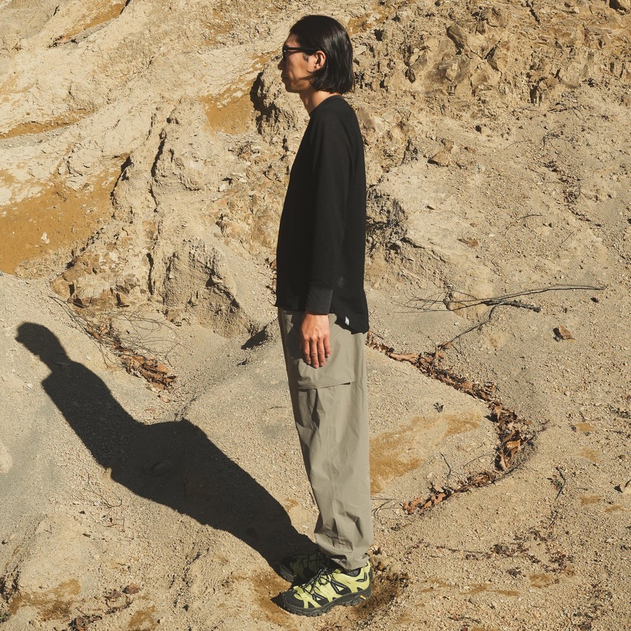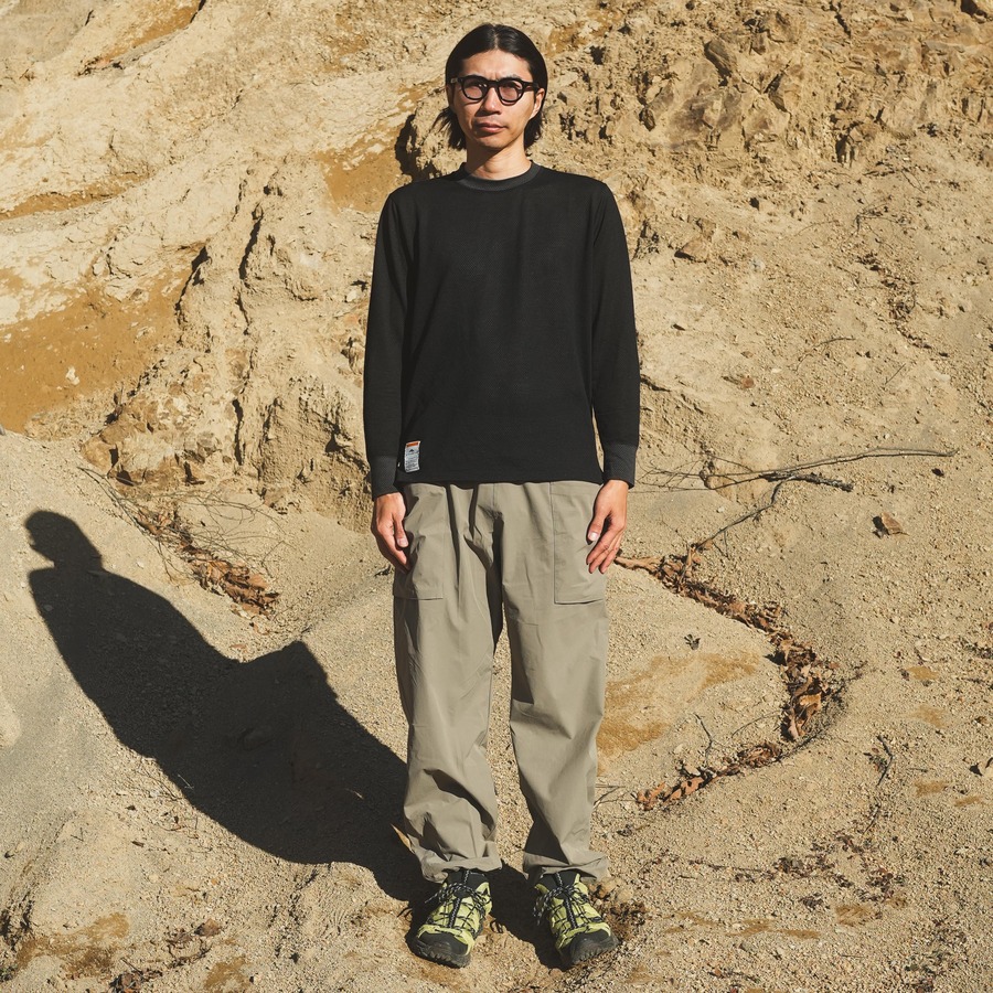 MMLT(MESH MOCK LONG T)はウール混紡のメッシュ生地を使ったモックネック仕様のロングスリーブTシャツです。ウールの弱みを化繊がカバーし、化繊の弱みをウールがカバーしたベースレイヤーとして最も望ましい一着と言えます。